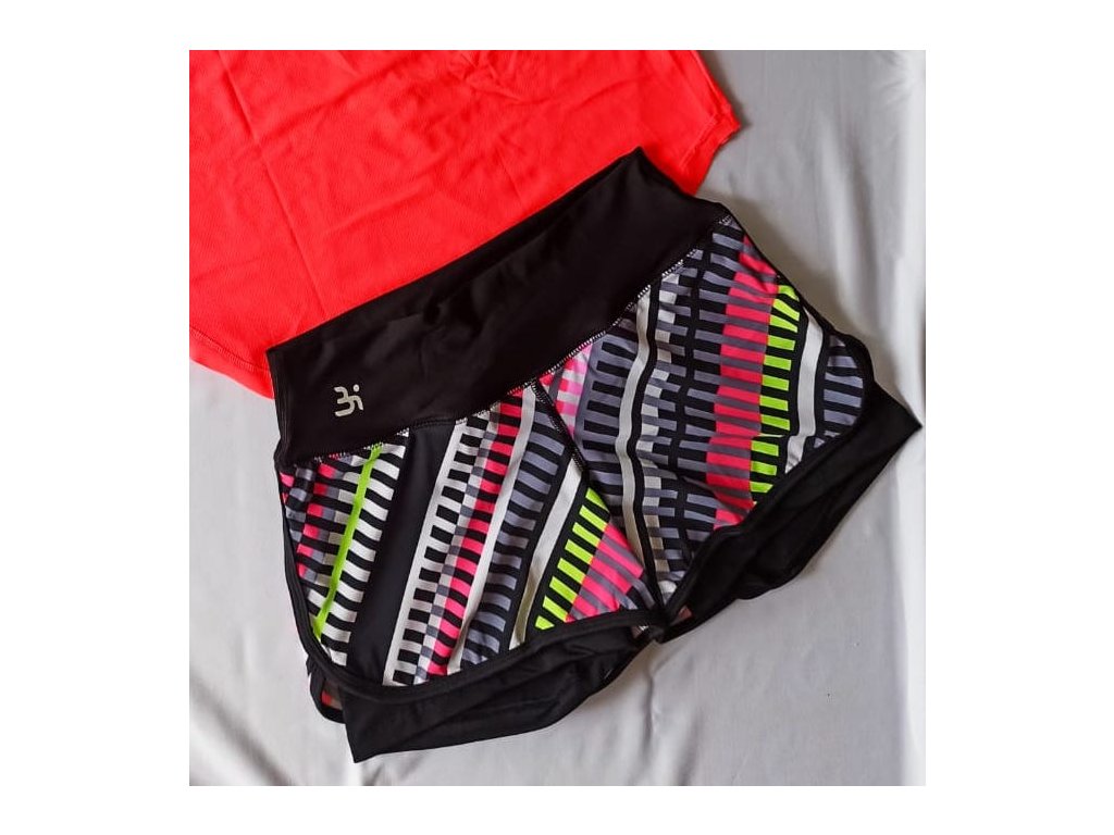 Ve volných elastických šortkách s pruhovaným designem jsou všité vnitřní elastické šortky. Chytré řešení 2 v 1, které v perfektní kvalitě přináší značka kolumbijská Biruba. Kompresní elasťáky stáhnou zadek a stehna, zvýšený pas ochrání bedra a formuje bříško. Skvělé na běhání na léto! Ochutnej kousek Kolumbie. Geometrické vzory jsou in!